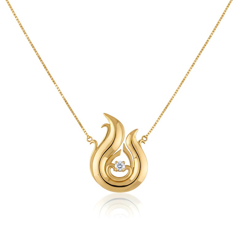 Bu kolyenin kalbinde yer alan pırlanta, ateşin tutkusunu, enerjisini ve yakıcı gücünü temsil eder. Altın, güneşin sarsılmaz sıcaklığını ve ebedi enerjisini yansıtırken, pırlantanın her bir yüzeyi, alevlerin dansını ve içimizdeki ateşi harlayan tutkuyu sembolize eder. Bu kolyeyi taşıyan, adeta bir kılıç kuşanır ve engellerin karşısında yılmaz bir iradeyle durur.