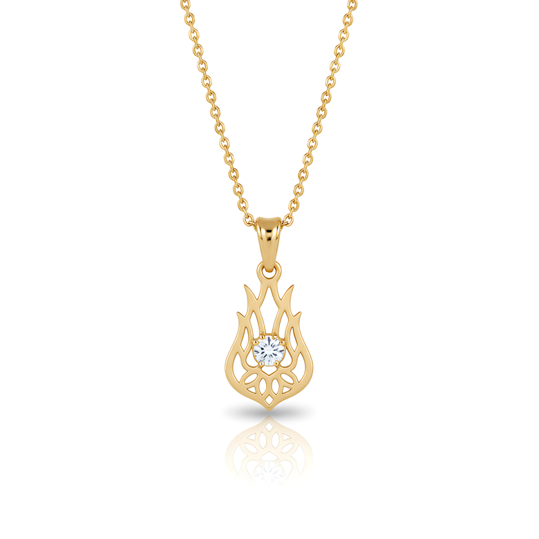 Bu kolyenin kalbinde yer alan pırlanta, ateşin tutkusunu, enerjisini ve yakıcı gücünü temsil eder. Altın, güneşin sarsılmaz sıcaklığını ve ebedi enerjisini yansıtırken, pırlantanın her bir yüzeyi, alevlerin dansını ve içimizdeki ateşi harlayan tutkuyu sembolize eder. Bu kolyeyi taşıyan, adeta bir kılıç kuşanır ve engellerin karşısında yılmaz bir iradeyle durur.